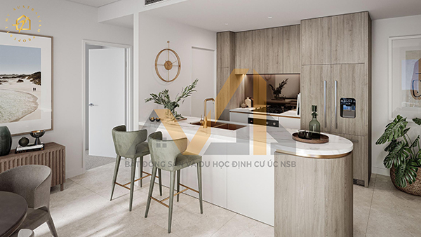 - Bếp với thiết bị từ thương hiệu Fisher & Paykel, mặt bàn bằng đá 40mm, tấm che bếp bằng kính, đồ dùng vòi sen Grohe mạ vàng tinh tế